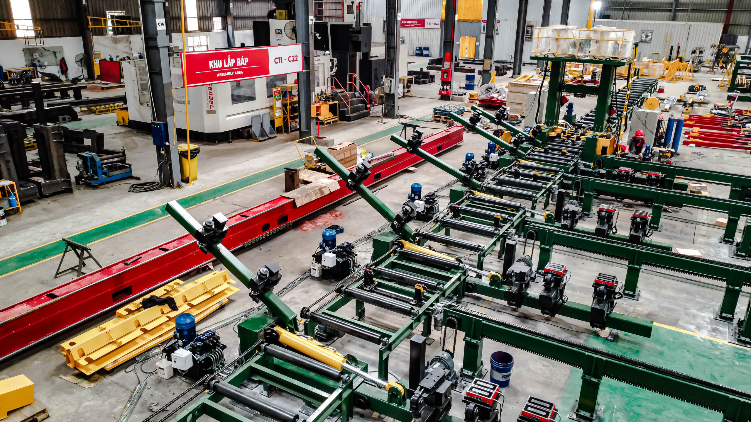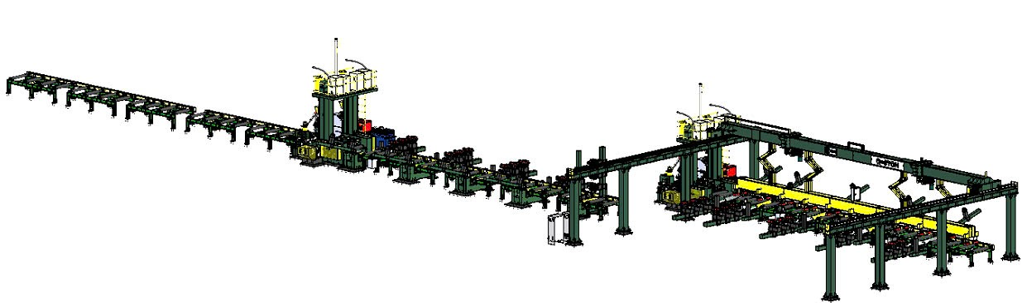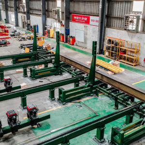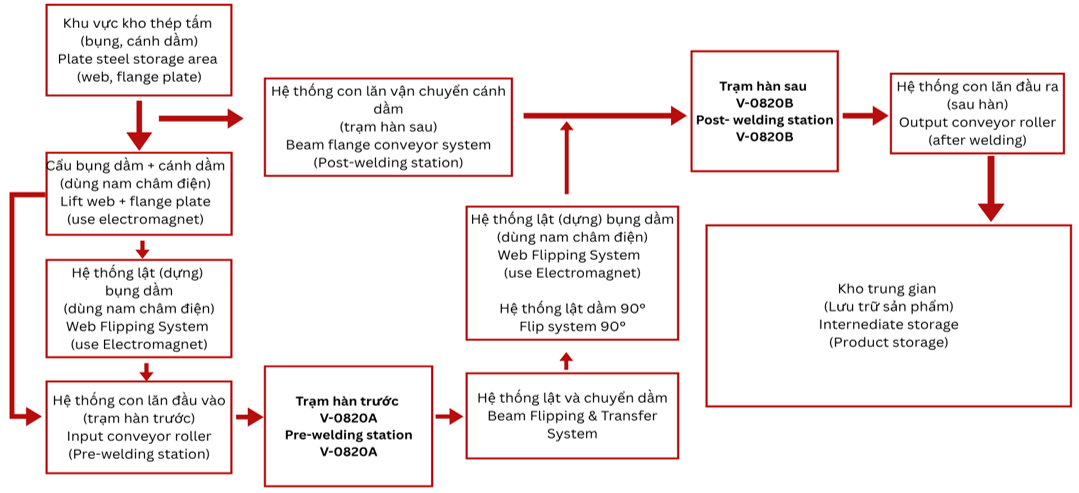 - Tự động hoàn toàn bước dựng cánh, kẹp bụng, nắn dầm và cấp/hút thuốc hàn.Tích hợp cụm tiếp mass trực tiếp vào cánh dầm, đảm bảo mối hàn ổn định và chất lượng cao.