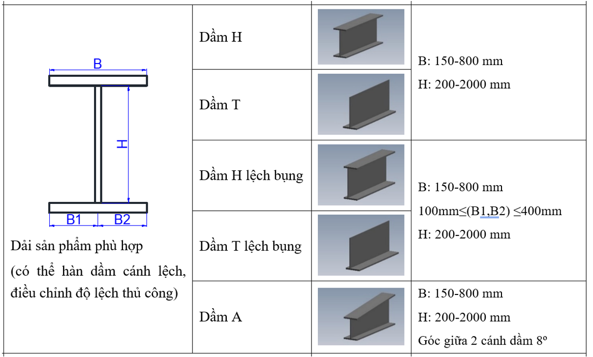 2 | Chiều rộng cánh dầm | mm | 150 – 800 |