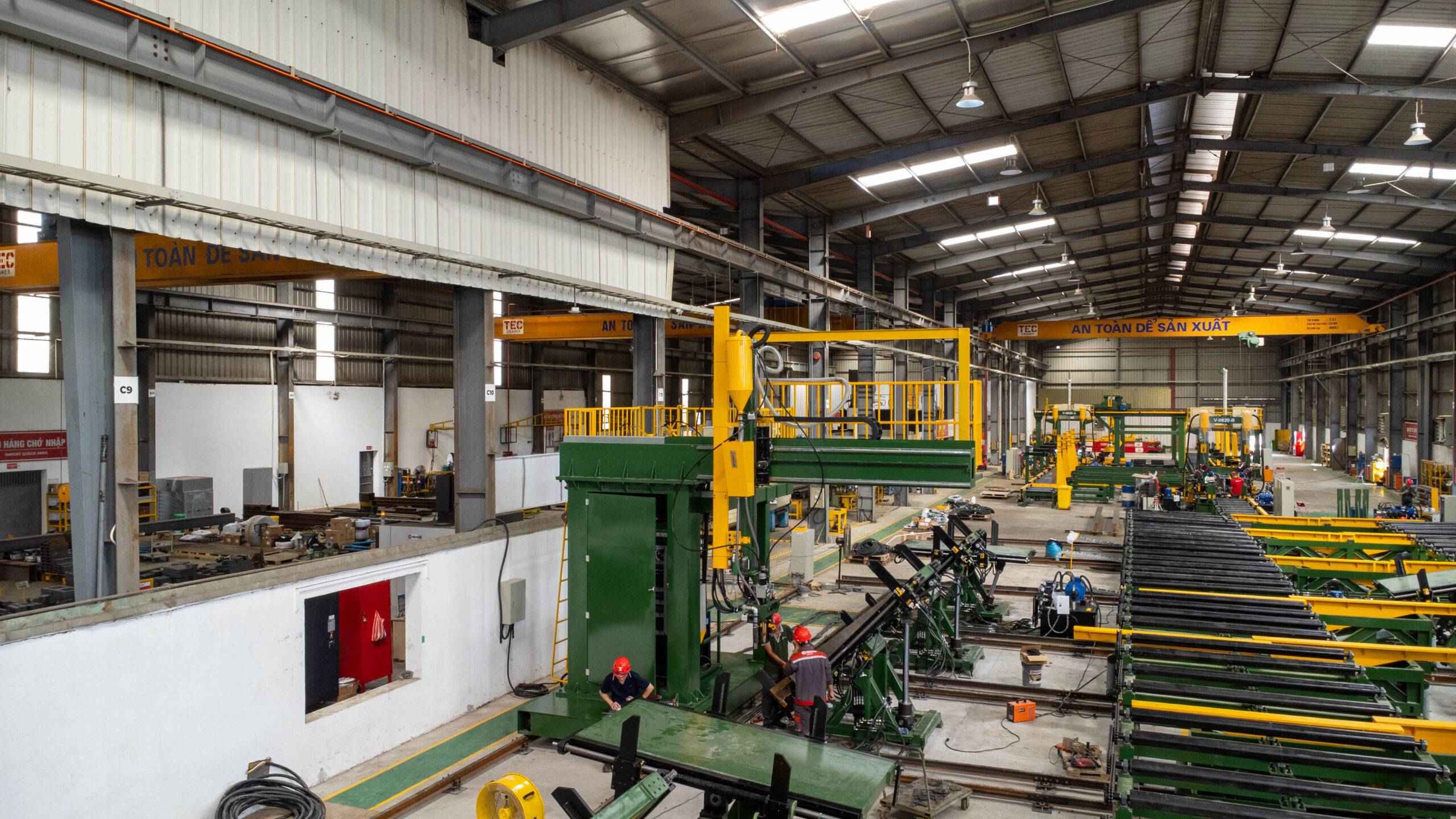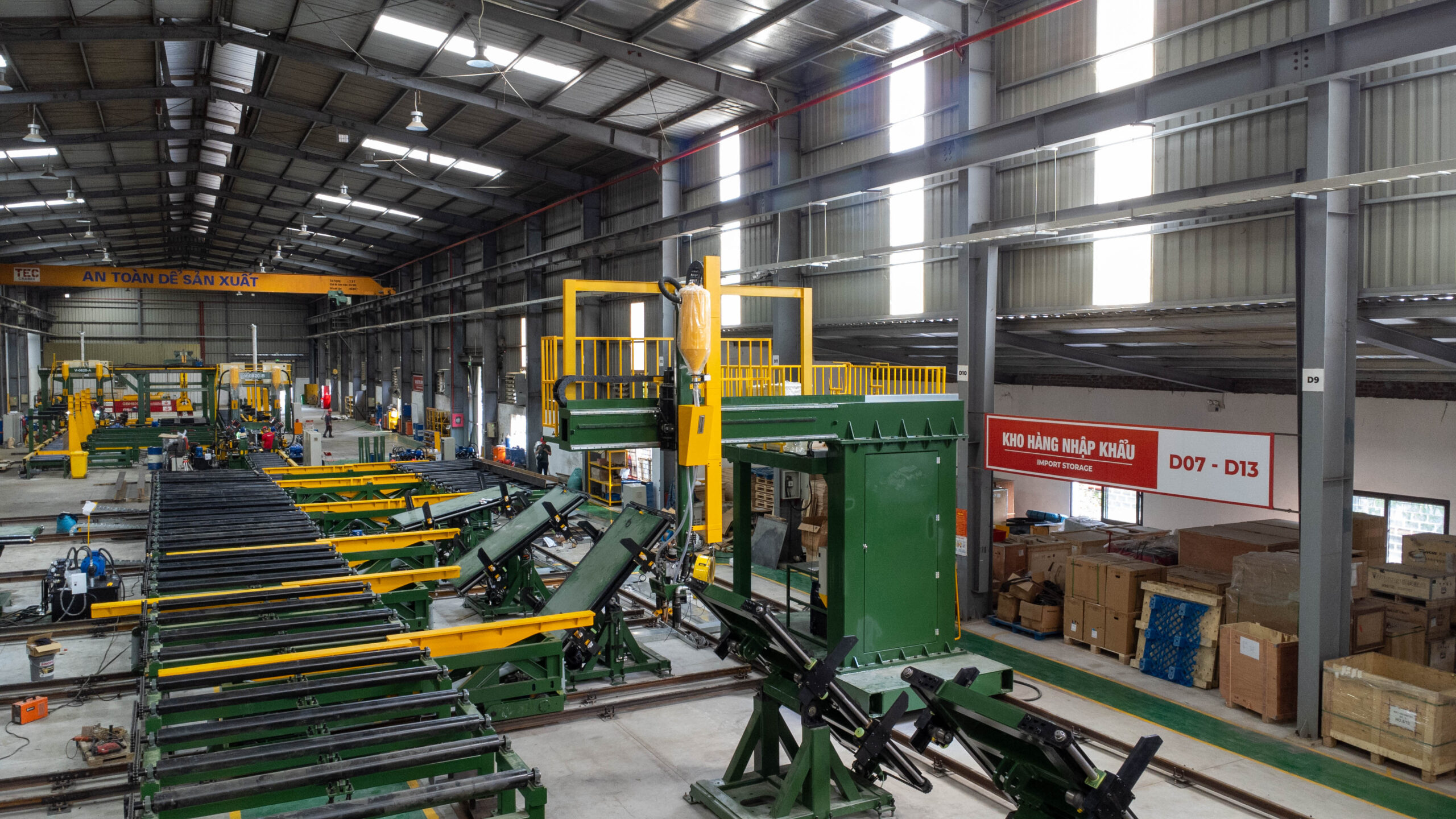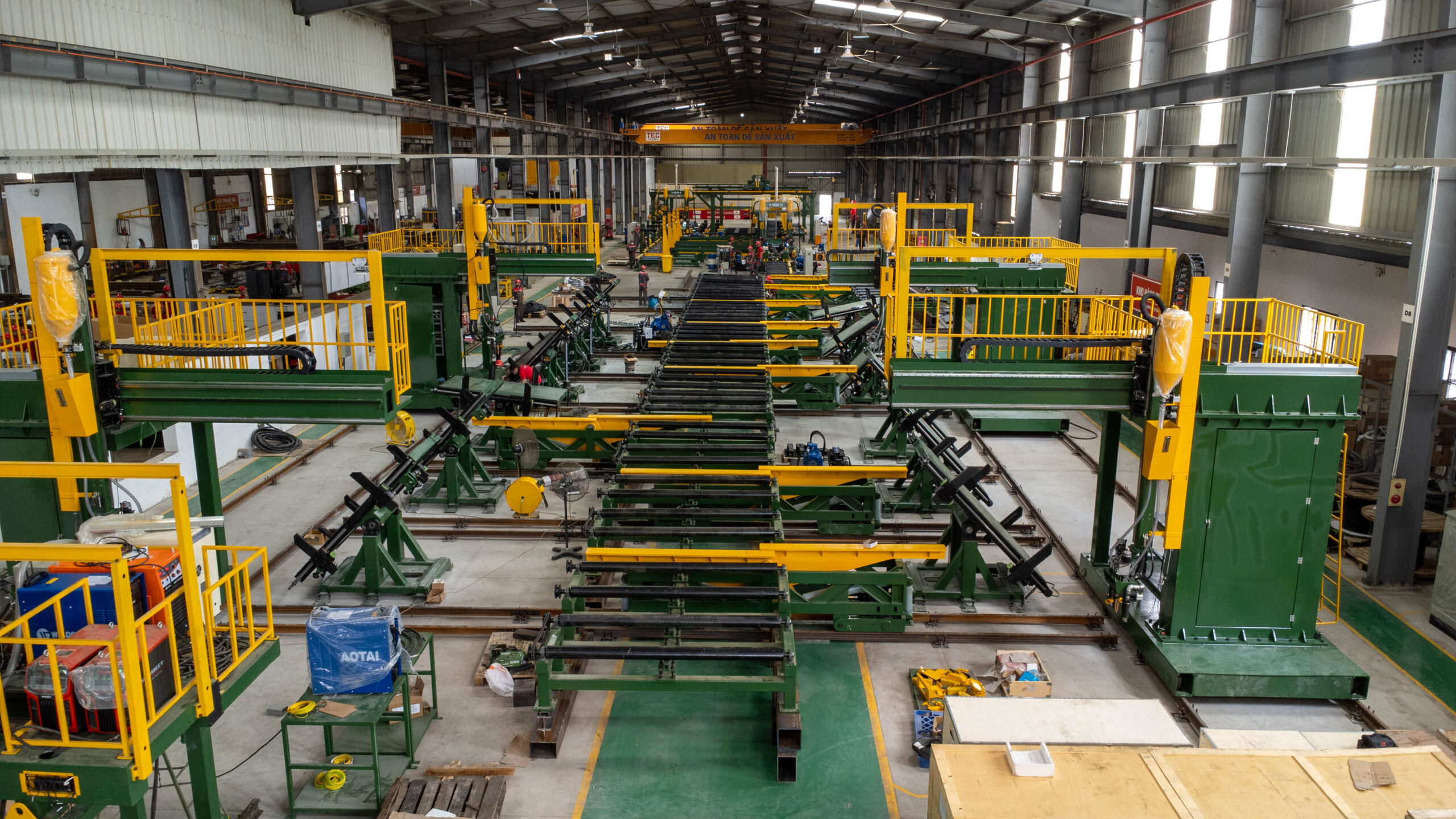 Dòng chảy sản phẩm bắt đầu từ dây chuyền đính hàn dầm tự động V-0820F.
